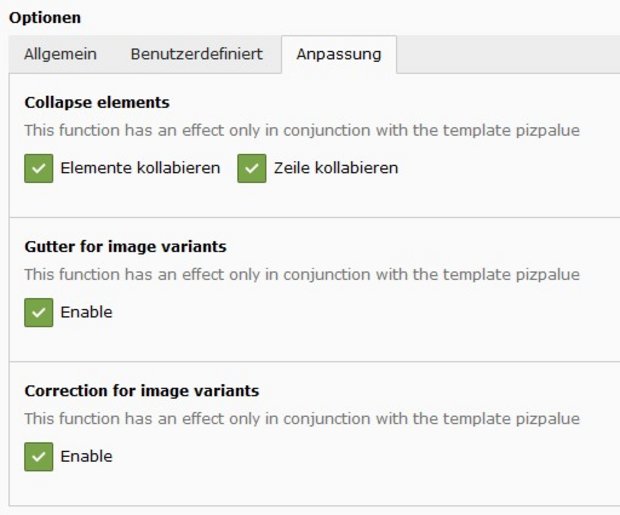 Um die Abstände zwischen Spalten-Strukturelementen und Inhaltselementen konsistent zu halten, werden Spaltenstrukturelemente standardmässig mit einem Rahmen ausgegeben. Die durch den Rahmen definierten Abstände werden jeweils beim ersten Inhaltselement pro Spalte, sowie der umschliessenden Zeile so berücksichtigt, dass die Abstände zwischen den Inhaltselementen bei allen Anzeigebreiten gleich bleiben.